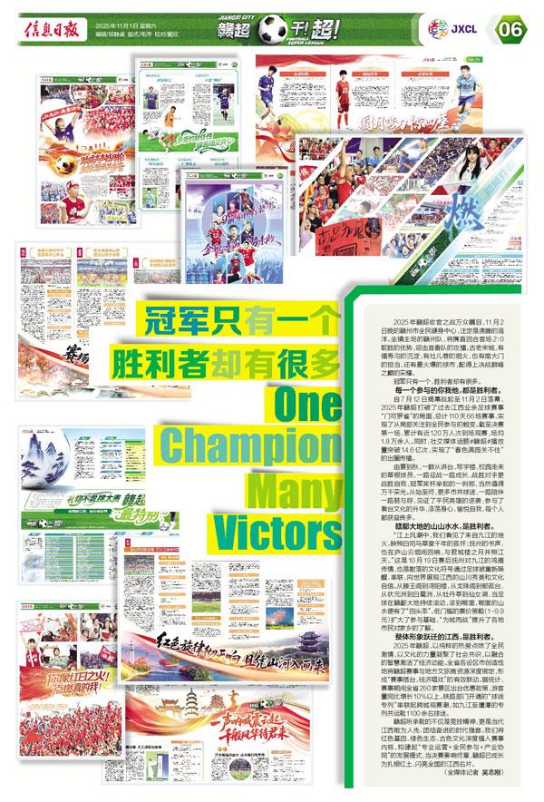 自7月12日揭幕战起至11月2日落幕,2025年赣超打破了过去江西业余足球赛事“门可罗雀”的局面,总计110天66场赛事,实现了从局部关注到全民参与的蜕变。截至决赛第一场,累计有近120万人次到场观赛,场均1.8万余人。同时,社交媒体话题#赣超#播放量突破14.6亿次,实现了“春色满园关不住”的出圈传播。