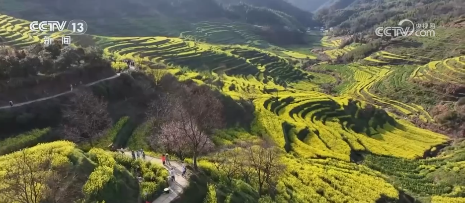 在婺源县篁岭景区,漫山遍野的梅花与油菜花争相斗艳,层层梯田变成金色花海。游客们穿行花间,赏花拍照,感受春日美景。
